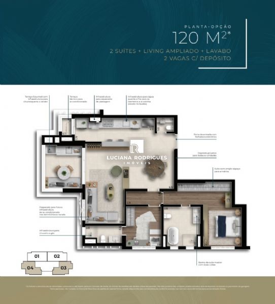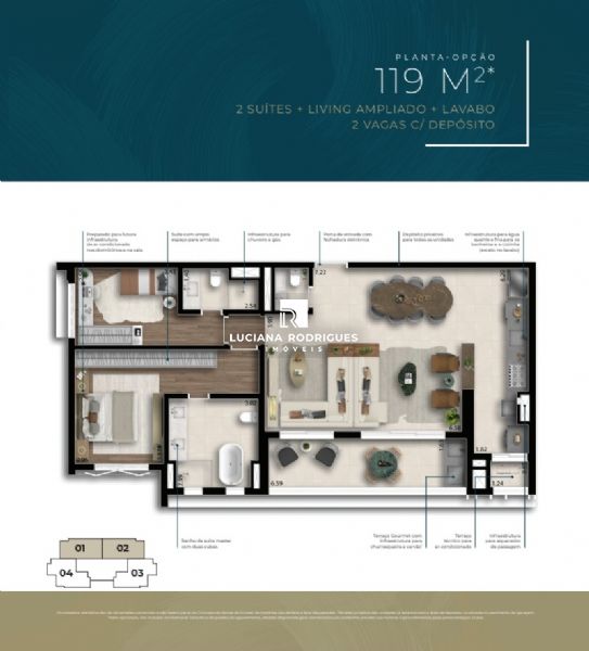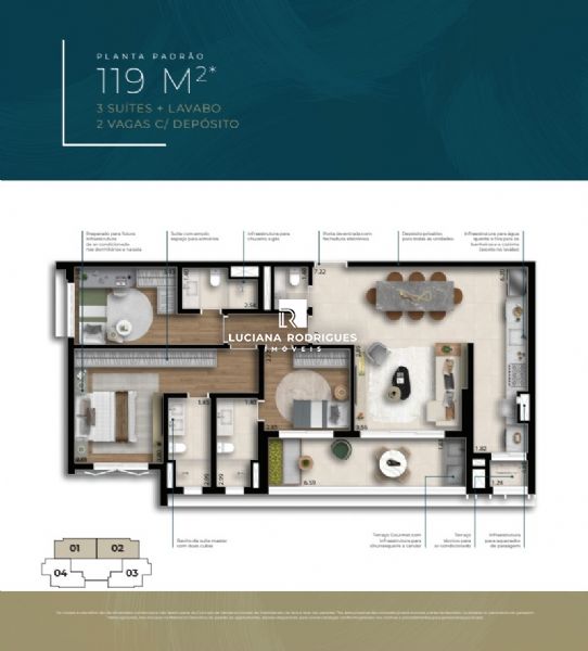 Detalhes: 119m² à 120m², 3 suítes + lavabo